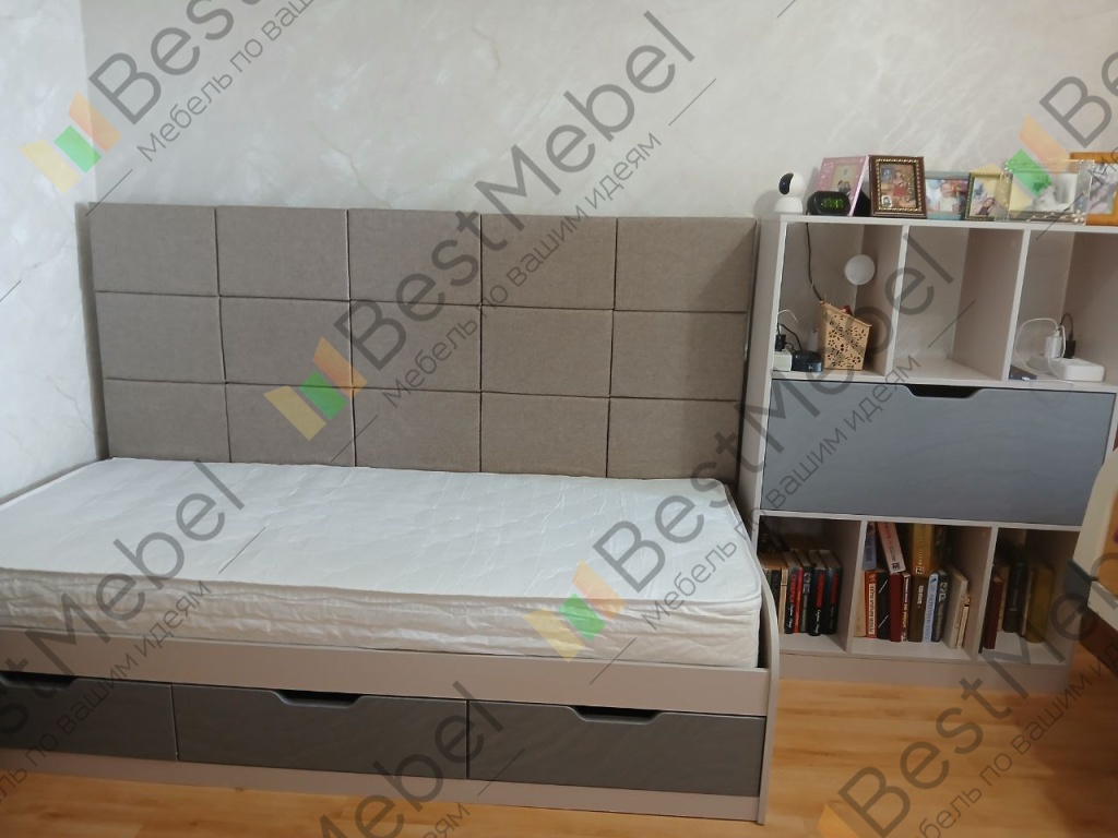 Кровать с 3 ящиками Монти BMS – это практичная тахта, подходящая для дневного отдыха и сна. Отличный вариант для современной детской или подростковой комнаты, модель оборудована просторным спальным местом с высокой спинкой. Для хранения постельных принадлежностей, книг и важных мелочей предусмотрены три выдвижных ящика в основании и встроенные в боковину открытые полки и глухое отделение. Особенно уютный вид кровати придает сочетание корпуса древесных тонов с мягкой обивкой, простроченной квадратами. Купить кровать с 3 ящиками Монти BMS приглашаем в наш интернет-магазин, подобрав цветовое решение.