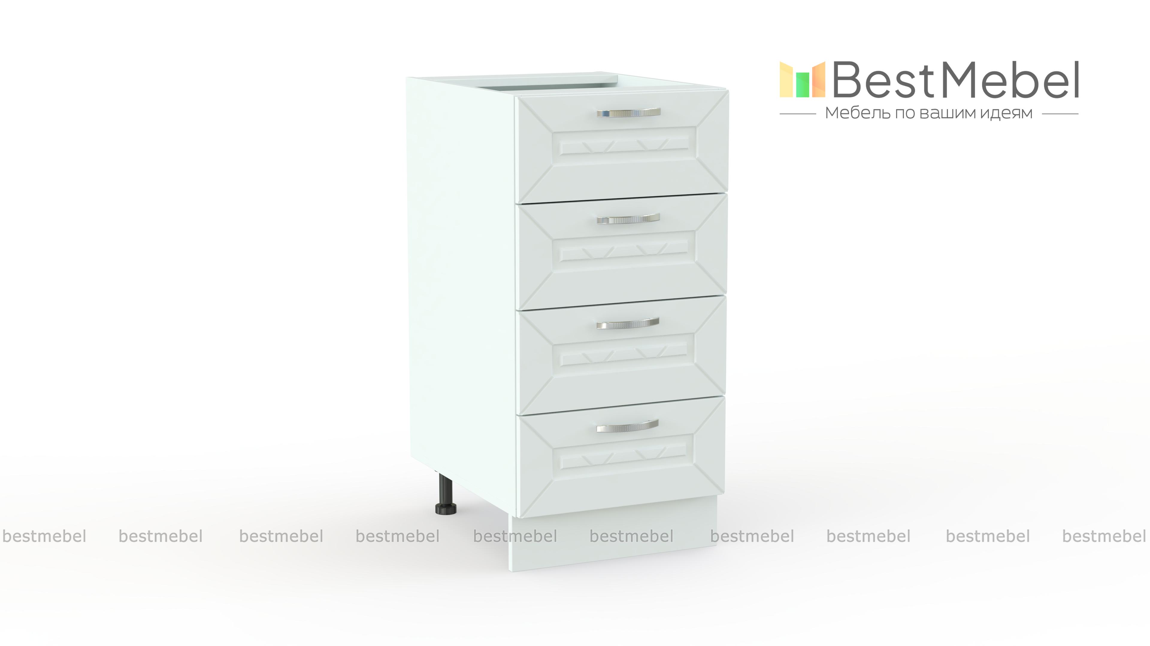Шкаф нижний 4 ящика Агава BMS дополнит напольный ряд модульного комплекта для кухни и незаменим для хранения мелочей. Компактный шкаф с четырьмя выдвижными ящиками позволит разместить столовые приборы и прочие аксессуары в одном месте и не тратить время на поиски нужной вещи. Фрезерованные фасады в общем для всей серии классическом стиле выполняются в светлых оттенках на выбор. Купить шкаф нижний 4 ящика Агава BMS вы сможете по доступной цене в нашем интернет-магазине.