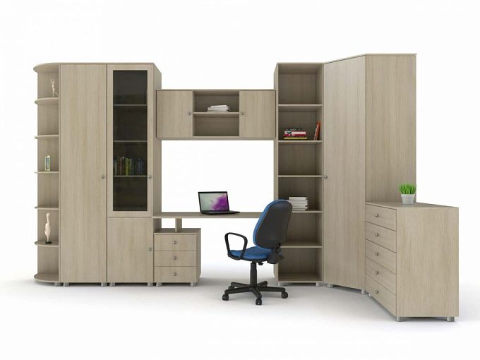 Детская Кирилл 01 BMS объединила рабочее место с продуманной системой хранения. Современная композиция включает в себя компьютерный стол, открытый и застекленный книжные стеллажи, торцевой скругленный стеллаж, угловой шкаф для одежды и бельевой комод с пятью выдвижными ящиками. Светлые древесные тона универсальны для интерьеров разного типа и создадут комфортную для учебы и отдыха атмосферу. Купить детскую Кирилл 01 BMS вы сможете в нашем интернет-магазине по выгодной цене.
