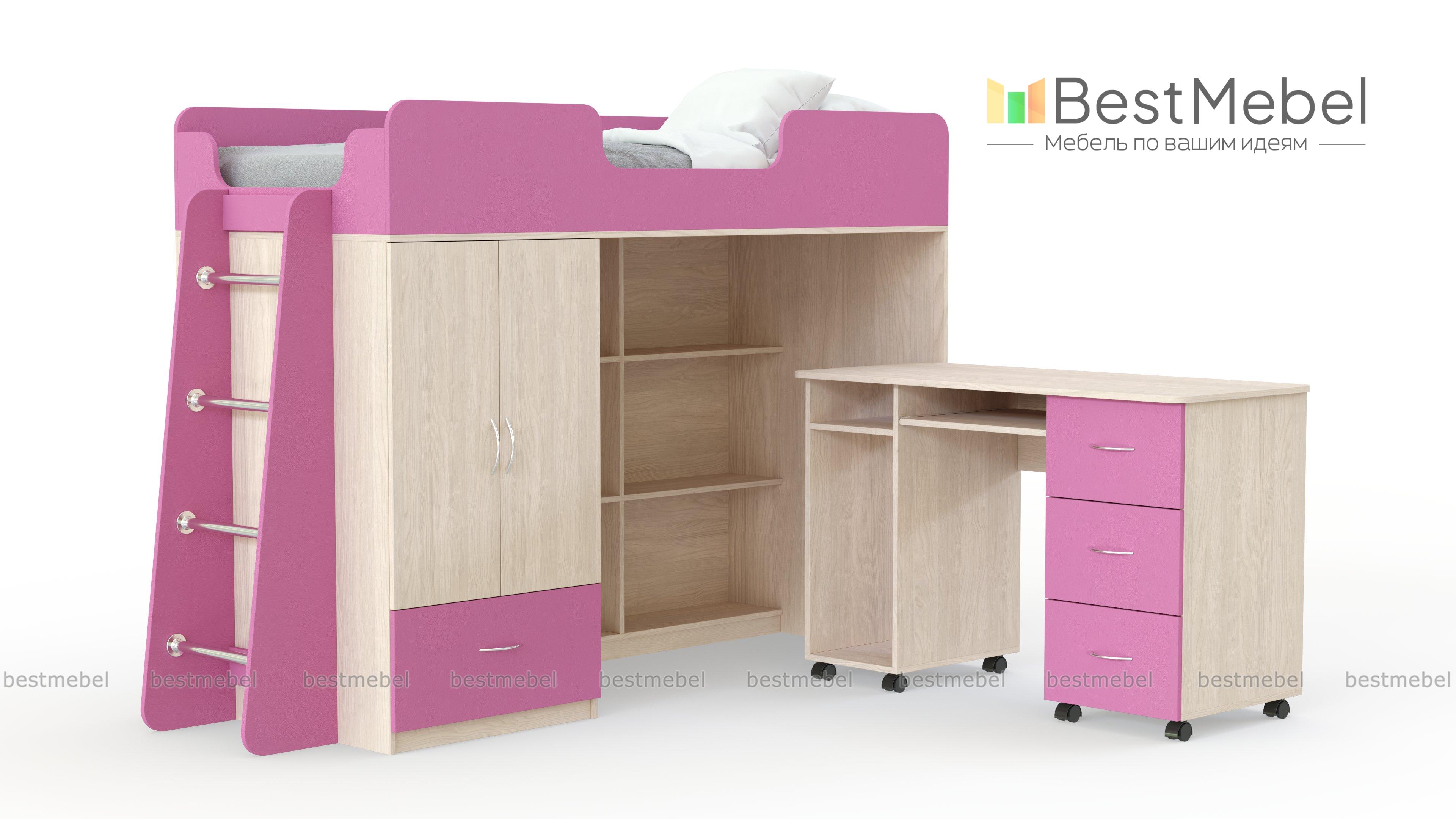 Кровать-чердак Миф 3 BMS поможет оборудовать всем необходимым даже небольшую детскую комнату. На первом ярусе кровати располагаются книжные полки, распашной шкафчик для одежды и выкатной компьютерный столик, который вы сможете спрятать в нише или разместить в любой удобной части комнаты. Спальное место защищено бортиком, а легко забраться в постель поможет ребенку надежная наклонная лестница. Купить кровать-чердак Миф 3 BMS, выполненную в сочетании древесных тонов и белого, приглашаем к нам в интернет-магазин.