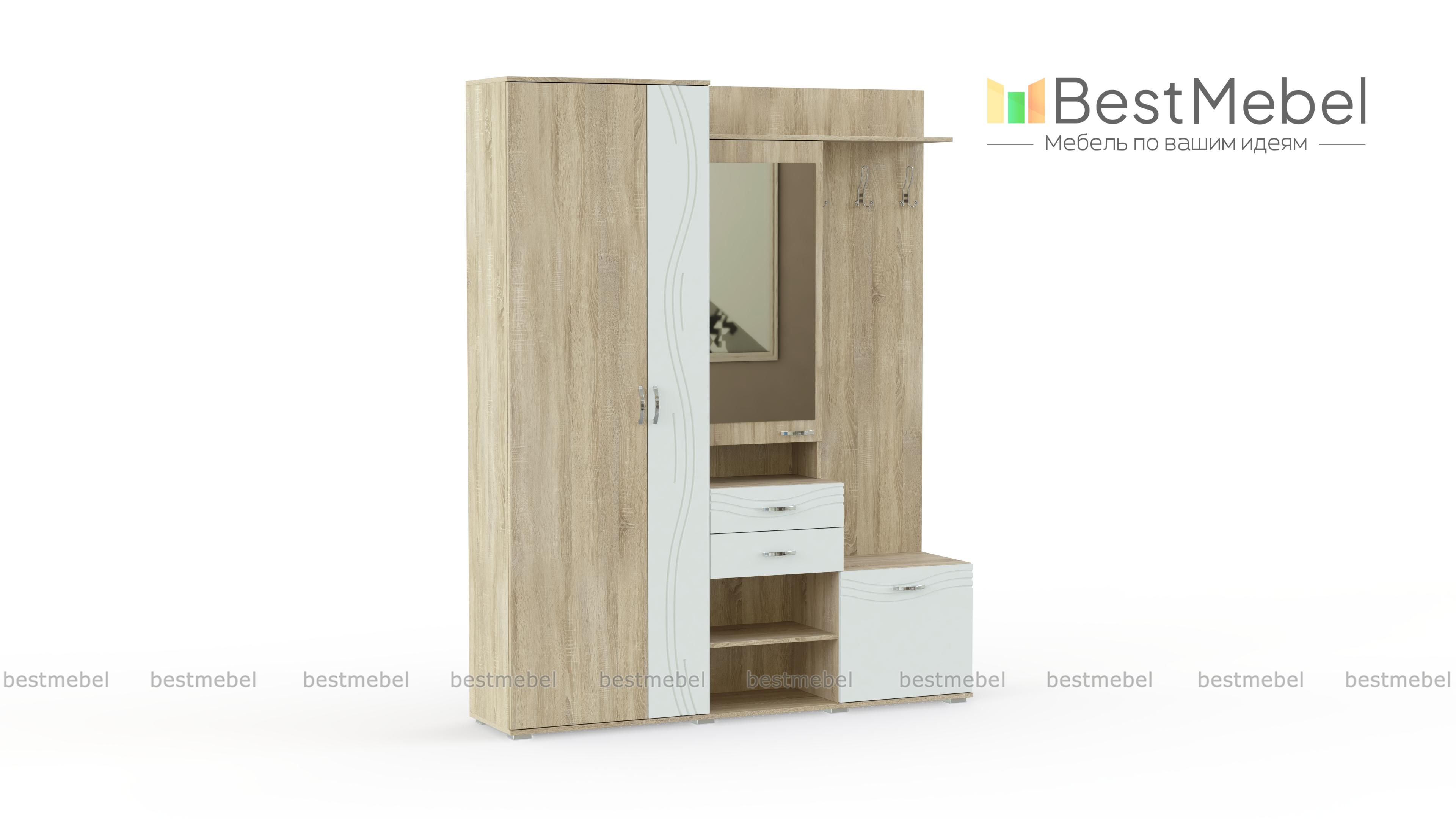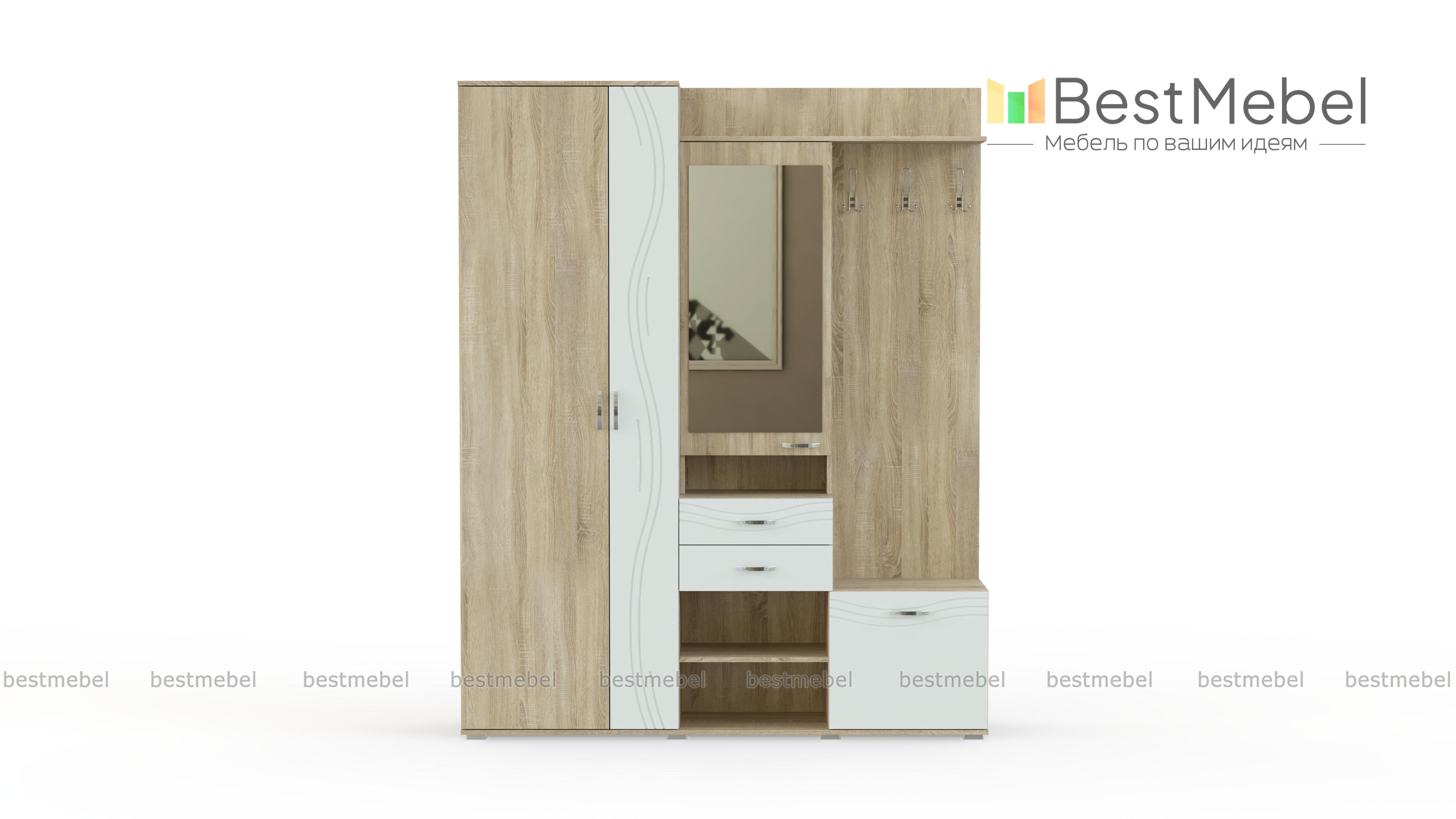 Средние габариты прихожей "Стиль-2" BMS подойдут как просторным, так и малым помещениям. В оформлении классические элементы гармонично сочетаются с современными решениями. Прихожая оборудована вместительным платяным отделением, открытой панелью с крючками, закрытой обувницей, выдвижными ящиками и полками. Вместительный распашной шкафчик для мелочей дополнен большим зеркалом на дверце. Фасады, выполненные в нейтральных оттенках под массив дерева и однотонном цвете с декором, легко впишутся в интерьер.