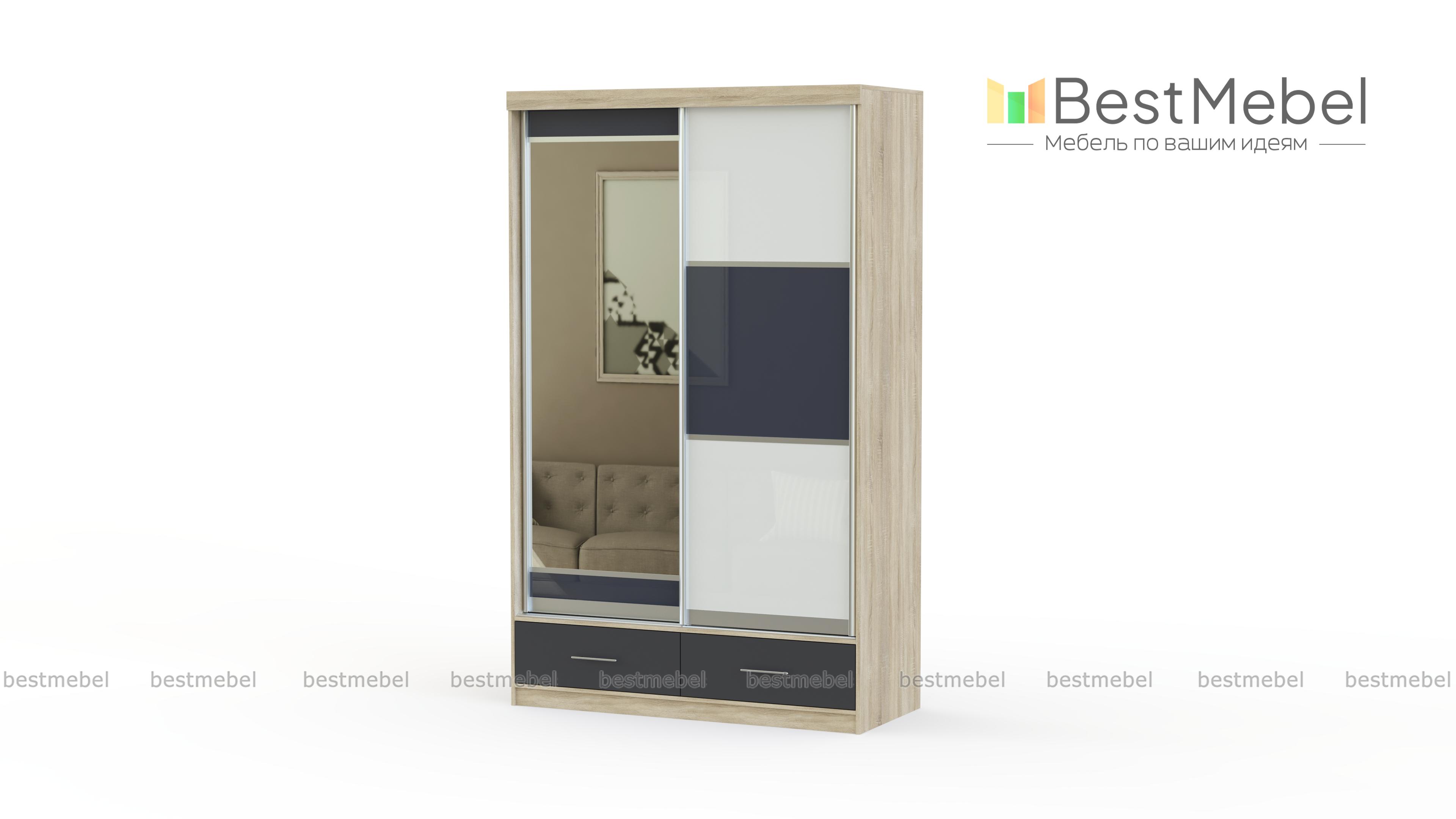 Внутреннее наполнение шкафа-купе – это 5 просторных ниш для Вашей одежды и обуви, 2 выдвижных ящика для мелочей, а также большое отделение со штангой для вешалок. Мы предлагаем варианты цветового оформления, доступные цены и услугу доставки, удобным для Вас способом.