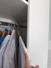 Шкаф красивый. Удобно, что можно заказать свой размер, выбрать комплектующие. Наша ошибка в выборе глубины шкафа: при расположении штанги в ширину и глубине 45 см "плечики" не умещаются. У нас крючок "плечиков" вращается, поэтому повесили чуть на искоса.