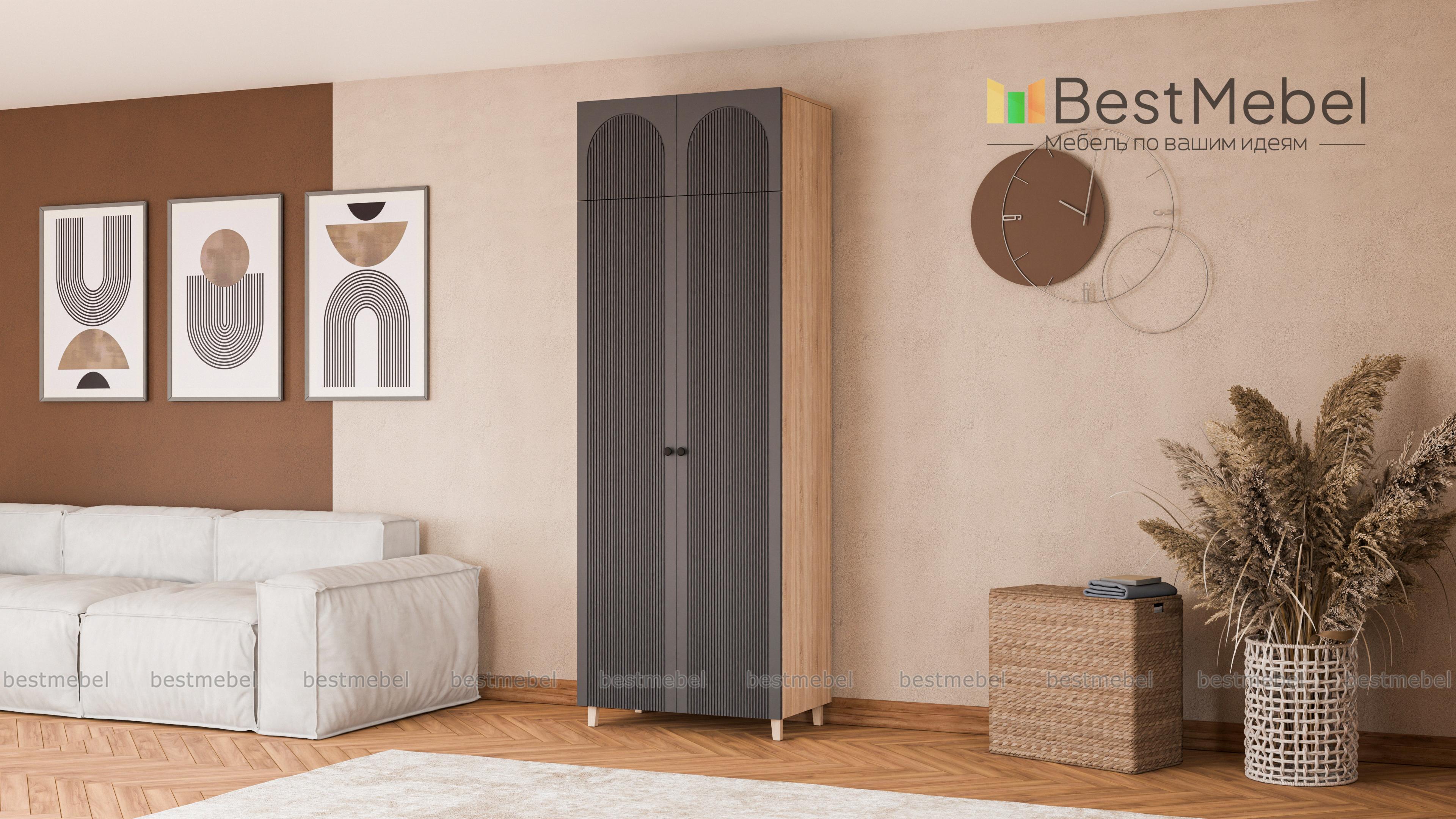 Шкаф распашной Рене 19 BMS — стильный и при этом достаточно универсальный со светлым фасадом и древесным корпусом. Наличие антресоли позволяет разместить больше вещей на ограниченном пространстве, а высокие ножки зрительно облегчают конструкцию. Вертикальная фрезеровка и арки на дверцах превращают гардероб в элемент дизайна современной спальни, прихожей или детской комнаты. Купить шкаф распашной Рене 19 BMS вы сможете в нашем интернет-магазине, по желанию изменив цвет и размеры.