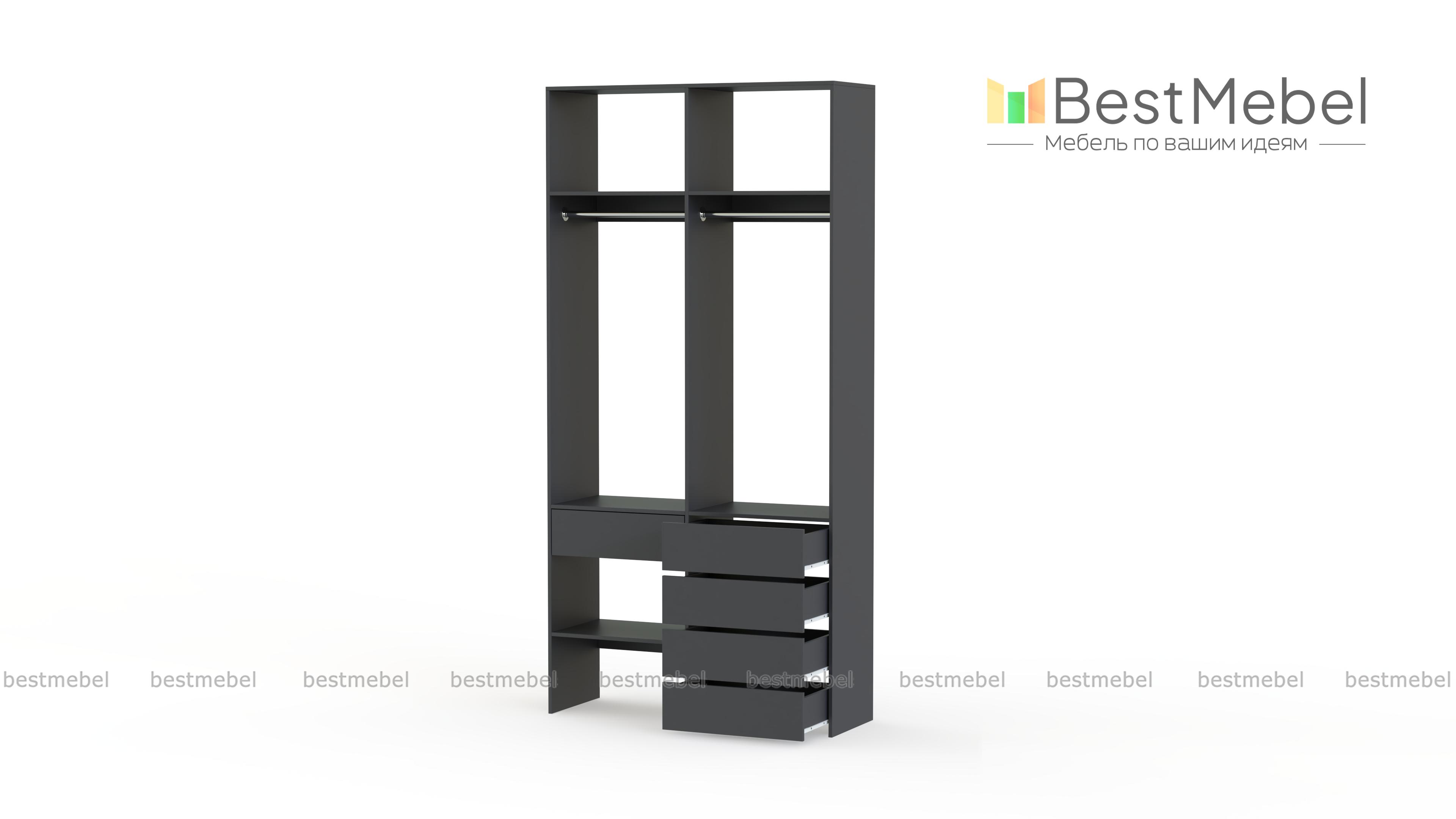 Стеллаж для одежды Мирта 46 BMS — стильный и функциональный, имеет удобную конфигурацию. Две штанги, полки на разной высоте и пять выдвижных ящиков максимально эффективно используют небольшое пространство. Двухсекционный стеллаж из прочной ламинированной ДСП прекрасно подходит для малогабаритных помещений, легко сохраняя порядок. Купить стеллаж для одежды Мирта 46 BMS в необходимом размере и любом оттенке из нашего каталога вы сможете на сайте интернет-магазина.