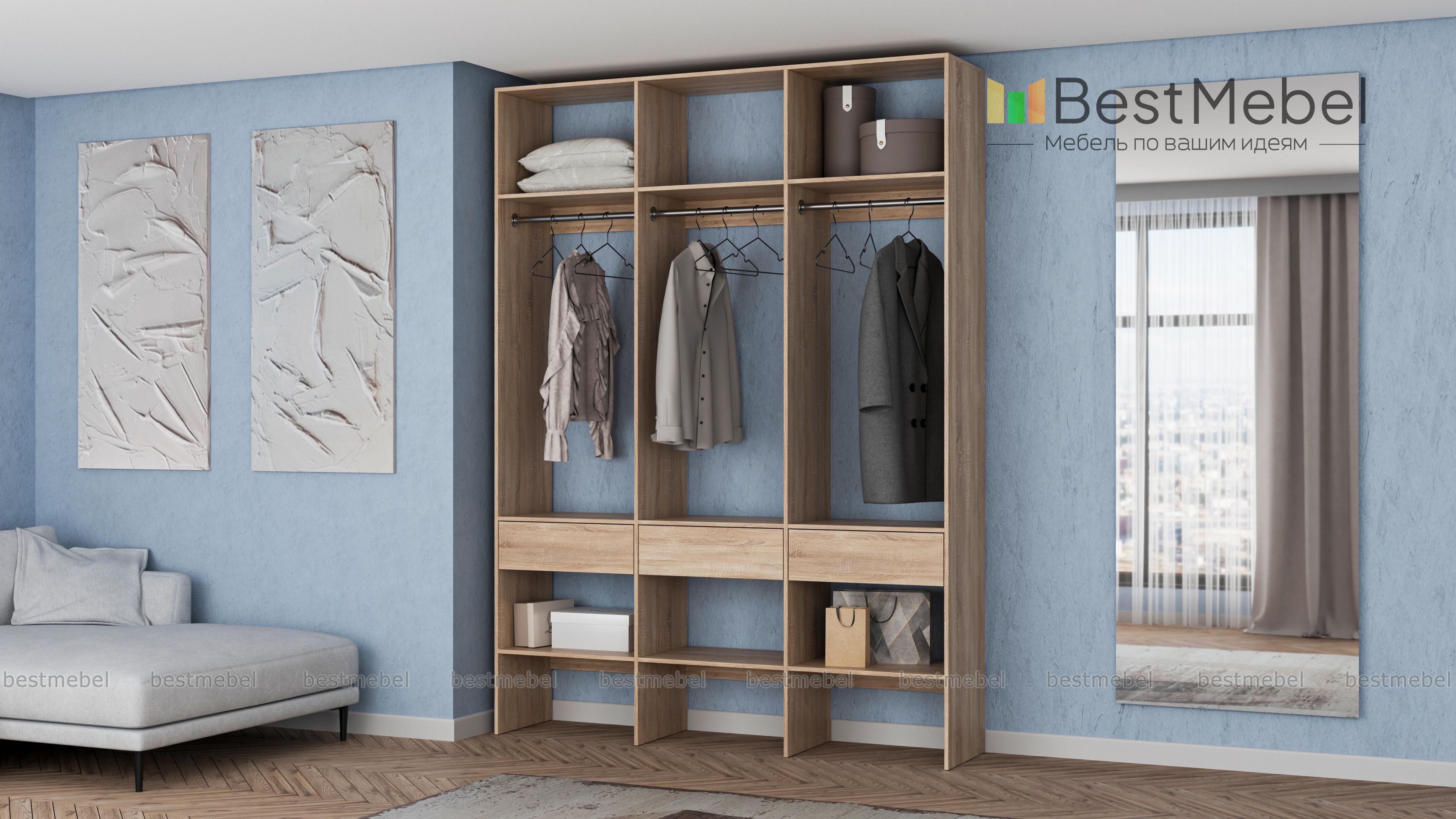Стеллаж для одежды Мирта 51 BMS — визуально легкая и надежная конструкция из ламинированной ДСП, которую легко вписать в интерьер. Трехсекционный стеллаж прекрасно подходит для современных прихожих и гардеробных. Для вашего удобства три бельевых ящика и обувные полки располагаются снизу, а пространство над штангами занято полками для редко используемых вещей. Купить стеллаж для одежды Мирта 51 BMS вы сможете на сайте нашего интернет-магазина, подобрав цвет и размеры.