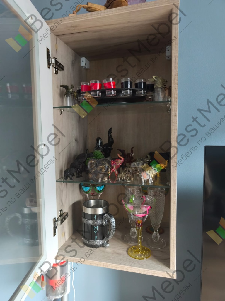 Заказывали стенку "Мираж" 2,5 года назад. За это время ничего не отвалилось, не сломалось, всё цело, всё радует. Изначально понравился лаконичный и необычный дизайн. А главное, можно заказать стенку по своим размерам - это очень удобно! Мне нравится, как получилось. Специально выбрала белую поверхность, чтобы пыль была меньше видна, так как не фанат уборки. Вообще не видна))) Да, как многие пишут, у нас тоже была проблема - отодрать наклейки со стеклянных полочек. Получилось с помощью спирта (спиртовых салфеток). Спасибо за хорошую уютную стенку!