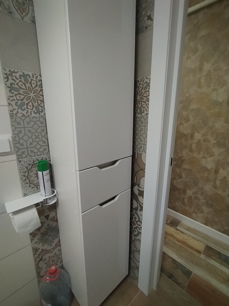 Прекрасный шкаф. Сделали точно по оговоренным размерам. Выполнили просьбу о стеклянных полках!  Жаль, что изначально не предусмотрена корзина для белья, но удалось купить подходящую по размеру и вставить в нижнюю часть шкафа. При доставке проверили целостность компонентов и стекла. Сборка проблем не вызвала.